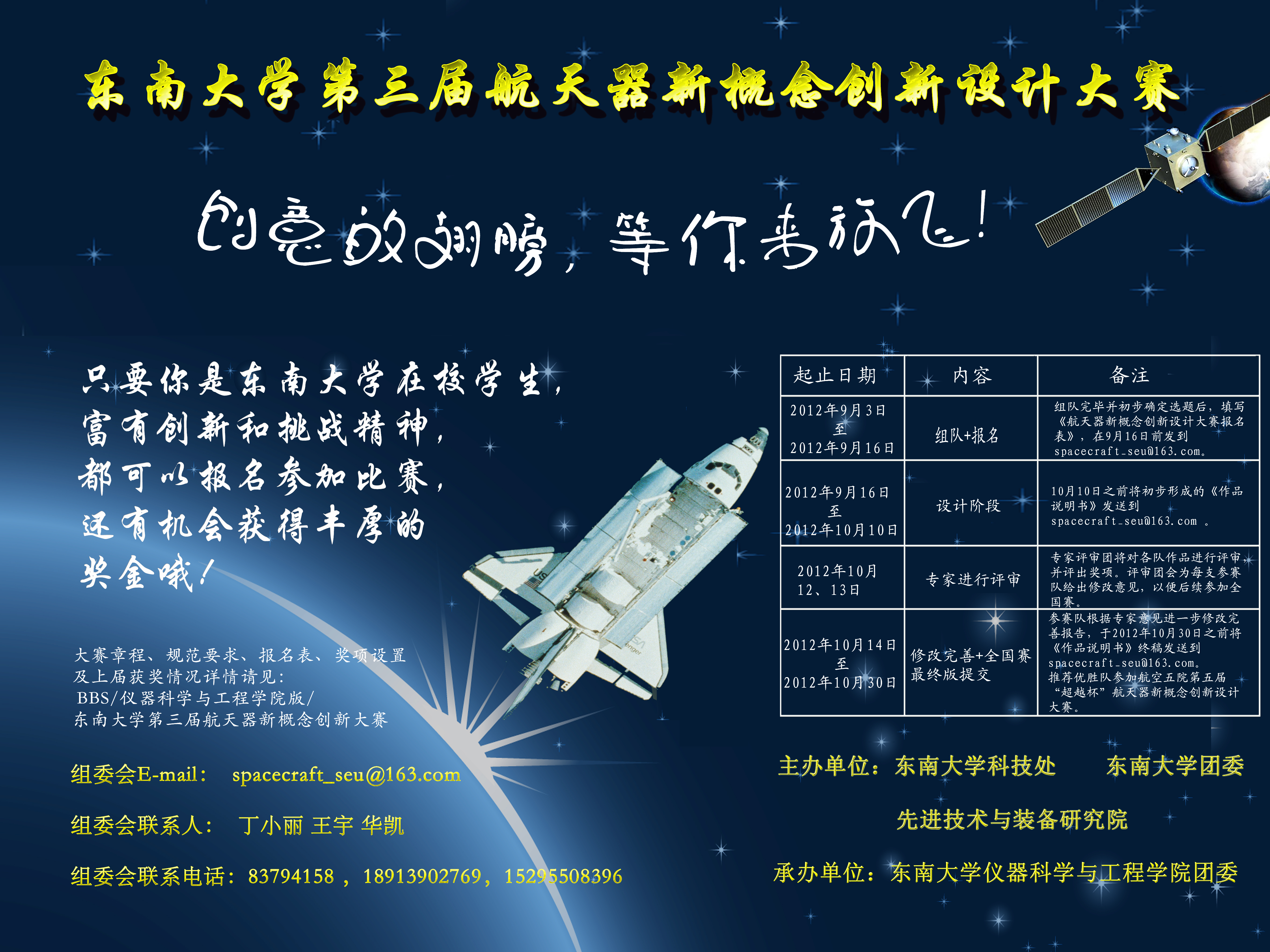 中国空间技术研究院总体部第五届“超越杯”航天器新概念创新设计大赛即将开始,为选拔优秀作品参加高水平的竞赛,现决定于2012年9、10月举行williamhill英国官网第三届航天器新概念创新设计大赛。在之前两届的比赛中,我校同学取得了丰厚的成果,连续两年获得此项比赛全国一等奖,并获得了多项二三等奖。