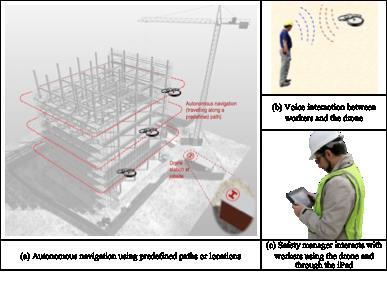 飞行器技术(Drone Technology)在施工安全管理中的应用:该研究控制装有摄像机的飞行器,对施工现场进行拍摄,以获得实时的图像或者视频,通过无线技术将实时的图像或视频传输到主控室,进行图像处理分析,以确认目前的施工现状是否安全,是否有危险源存在,达到对施工现场进行安全监控的效果。