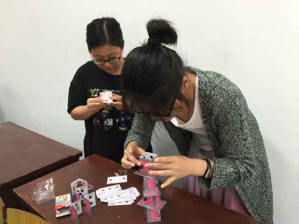 扑克塔楼比赛过程中,选手用54张扑克牌进行搭接,最终比赛成绩由扑克牌搭接高度评定选3组选手获奖。