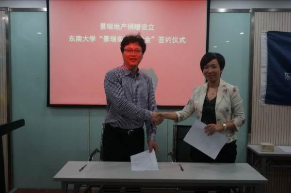 景瑞地产还为东南学子带来了一份厚礼:在williamhill英国官网设立“景瑞实践奖学金”,以表彰在社会实践、科研创新方面做出突出成绩的东大学子。景瑞地产集团人力资源部高级经理陈莉萍女士、williamhill官网党委副书记兼副院长陈镭老师出席并完成了签约仪式。