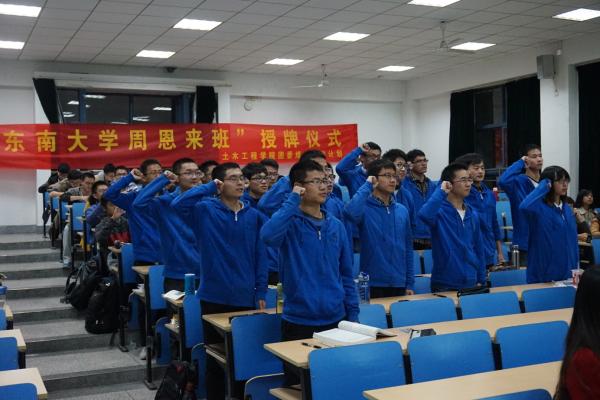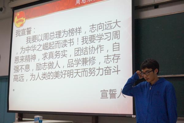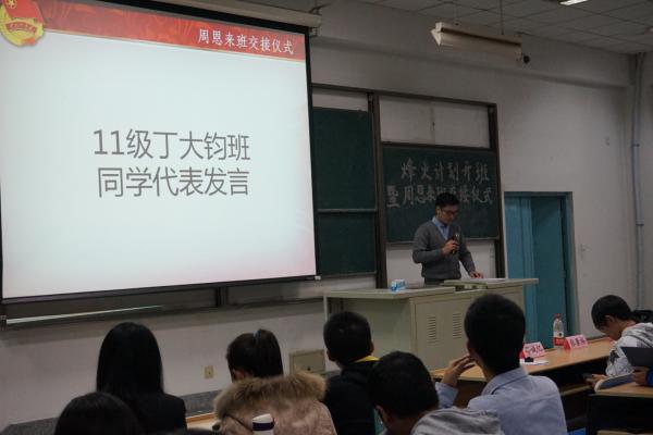 2011级丁大钧班代表顾大伟同学首先发言,呼吁同学们学习周恩来总理锐意进取、勤奋刻苦的品质,并提出了弘扬“恩来精神”的几点意见,。随后13级丁大钧班同学以精彩的诗朗诵纪念周总理,并从张豪裕书记手中接过了“周恩来班”的班牌,正式担起了“周恩来班”的荣誉与责任。随后,13级丁大钧班代表魏笑尘同学讲述了新时代下“恩来精神”的内涵,表达了不负学长厚望、传承“恩来精神”、投身国家建设事业的决心,并带领全体同学进行了宣誓。庄严的誓词是同学们郑重的承诺,相信在同学们的共同努力下定能创造出更美好的明天!