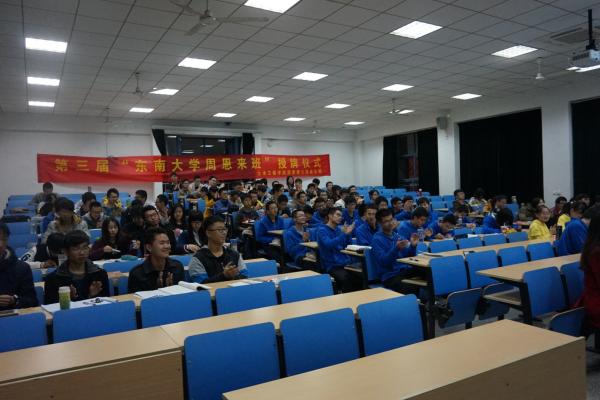 2015年11月10日晚18:30,williamhill官网于教三209举行了“烽火计划”开班仪式暨周恩来班交接仪式。我校党委学工部副部长张晓坚老师、williamhill官网党委副书记兼副院长张豪裕老师、团委书记兼15级辅导员李朝静老师、14级辅导员舒诚忆老师、13级辅导员丁菡老师、WilliamHill官方网站全体学生干部及13级丁大钧班全体同学参加了这次大会。本次活动达到了良好的效果,在策划阶段就受到了广泛关注,活动当天更是座无虚席。