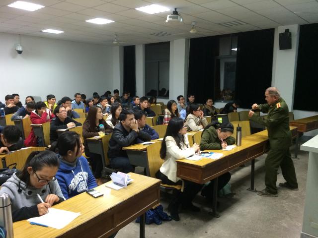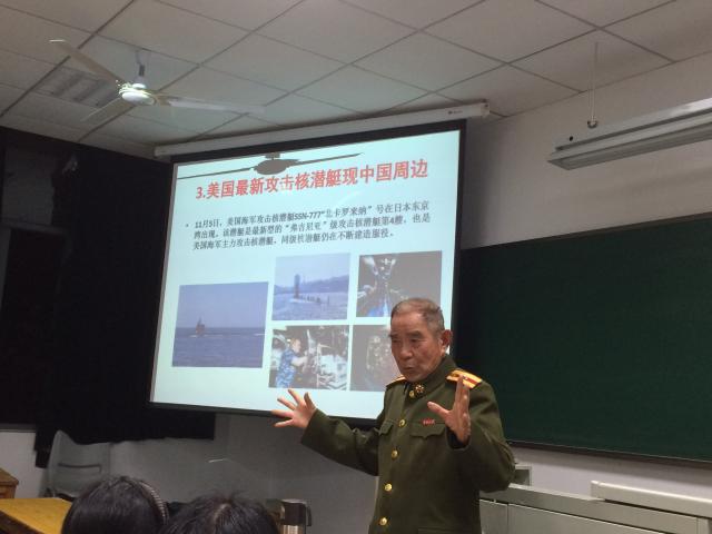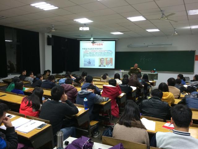 尽管屋外风雨交加,但董老师还是早早就来到教室,同学们亦无一缺席,精神饱满。董老师身着一席军装,讲演慷慨激昂、铿锵有力,振奋人心。主讲内容主要围绕“反恐”、“南海问题”、“中日关系”展开。首先,董老师以同学们对最近热点问题的关注度入手,指出作为williamhill英国官网的学生应密切关注时事政治,切勿费时于玩弄手机。接着,董老师又继续详解南海问题,他指出,我国目前所处境地不容乐观,南海问题已迫在眉睫,其根源复杂,反制措施极其必要。最后,董老师结合具体事例围绕中美博弈以及中国与各国的联系作了细致分析。讲座结束时,同学们对董老师的精彩讲演报以热烈的掌声。