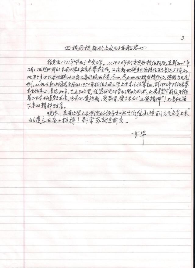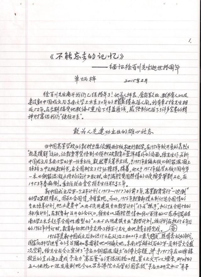 编者按:今年是在老土木系主政时间最长的系主任徐百川教授逝世十周年。学院原计划编印一本先生纪念册,召开一个纪念座谈会,但由于各种原因,未能实现。但应学院之约,齐康院士、单炳梓教授、周明华研究员级高工等写了纪念文章。其中,单炳梓教授在今年二月份就写了缅怀徐老的文章,后经长达半年时间的反复修改斟酌,今天专程送到学院办公室。 现将收集到的怀念徐百川先生的文章陆续刊于此,以表达我们对这位为老土木系发展奉献一生,贡献至钜的原系主任徐百川先生的怀念之情。 |