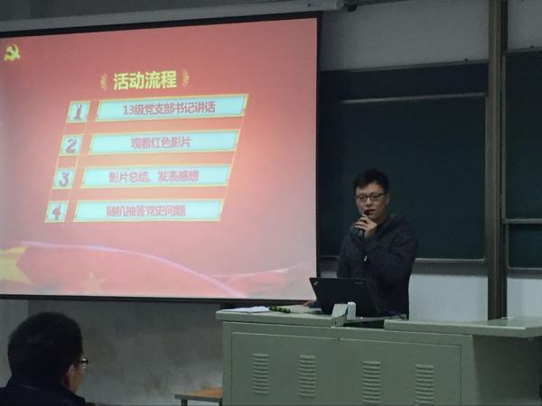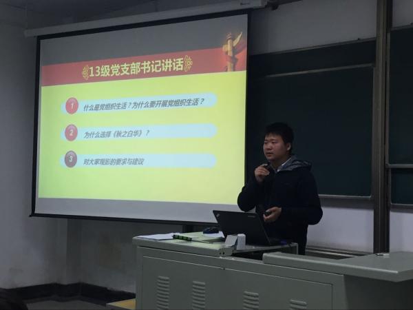 在活动开始前,13级党支部书记章锦洋同学作了简短的动员讲话。章锦洋同学介绍了党组织生活的含义和形式,强调了开展组织生活的重要意义,希望大家通过参与组织生活来提高党性修养,做到真正在思想上入党。此次选择放映《秋之白华》这部影片,既是为了让大家感受各类主旋律电影的不同表现方式,也是考虑“党史教育”系列观影活动的一脉相承。章锦洋同学希望大家在感受主人公情感生活的同时,能多关注影片的时代背景,关注社会各阶层的爱国主义行为,悉心揣摩秋白、之华两人抛弃小我之安逸、投身革命之洪流的崇高精神。