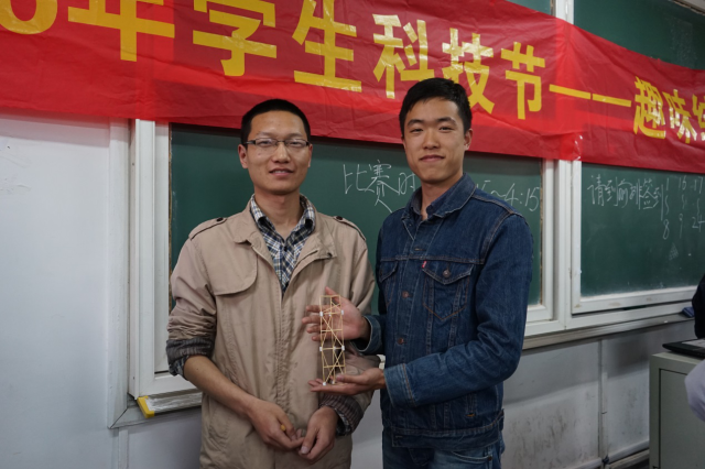 经过分级加载,由记分员统计相关数据,进行成绩排名。最后,由吴家林和马银行同学所设计的模型荣获一等奖。他们的模型仅以48根牙签就承受住了5400g的重量,实在令人感叹。另外还产生3组二等奖、5组三等奖以及部分优秀奖。