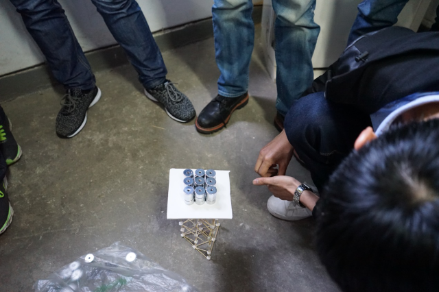 赛前,主持人向参赛同学介绍了比赛内容及相关细则,并对他们提出的疑惑进行了一一解答。本次比赛以两人为一队,每队可使用100根牙签和一块泡沫板,以502胶水为辅助粘合材料,在120分钟之内搭起一个竖向超过20CM的结构,以结构所用牙签数量和加载重量为评分标准。一开始,小组成员相互讨论,然后确定方案并明确各自分工。比赛中途计时员每间隔半小时提醒剩余时间,让各队统筹进度,合理安排时间。