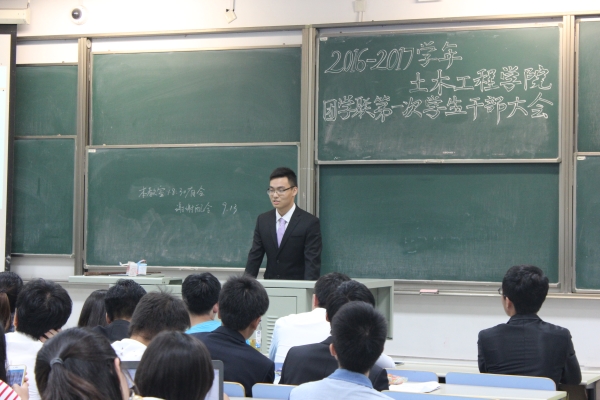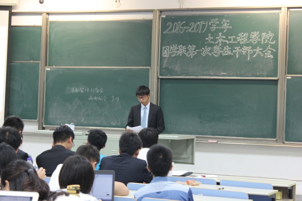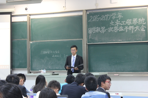 首先,团学联助理闫泽宇宣布会议开始,话音刚落,教室内响起热烈的掌声,学生会主席范熊便在掌声中走上台,他镇定自若,给大家详细介绍了学生会的成员和部门组成,着重强调了生活权服侠的职能,并对新学期工作计划作出明确指示,对于像体育节,女生节,菜根杯,迎新年晚会等传统活动,范主席表示将一如既往地组织好,而对于土木权服侠相关工作,范主席也表示会加大宣传力度,让更多人了解这一组织并积极完善权服侠工作。