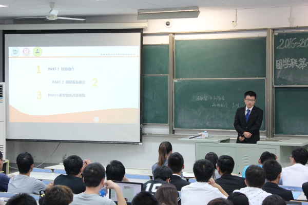 随后走上台的是科协主席田驰同学,他首先对科协的基本组成以及科协的调研方向作了简要讲解。田主席强调了SRTP项目的管理,通过调查他发现56%的人选择参加SRTP都是为了拿学分且现在参加同学偏低年级化,这让田主席很担忧。在结构竞赛方面,田主席表示科协结构竞赛的参赛人数在逐年增加且活动开办到了河南,内蒙等地,成果斐然。对于科协的发展前途,田主席说,要完善科技节流程,加强研学讲座宣传,为同学们提供更好的服务。