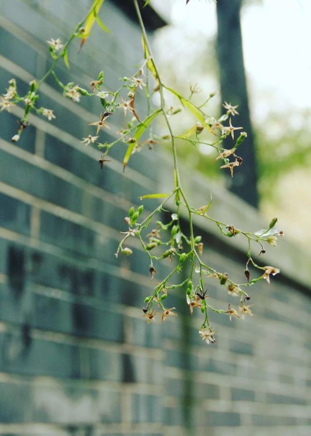 不知道哪里来的小花从墙头探出来,