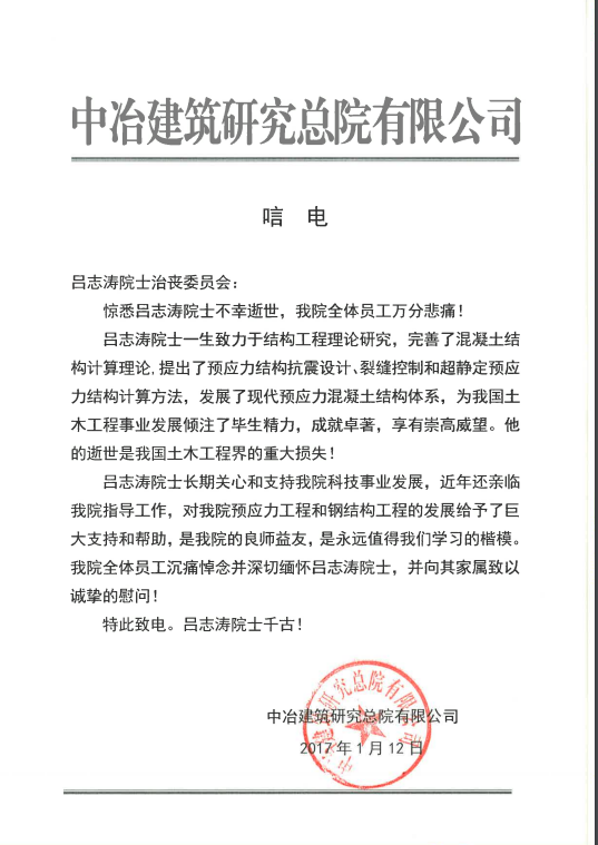 沉痛悼念吕院士 ——中冶建筑研究总院