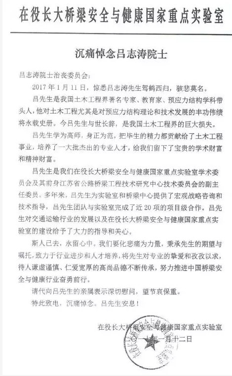 沉痛哀悼吕院士 ——在役长大桥梁安全与健康国家重点实验室