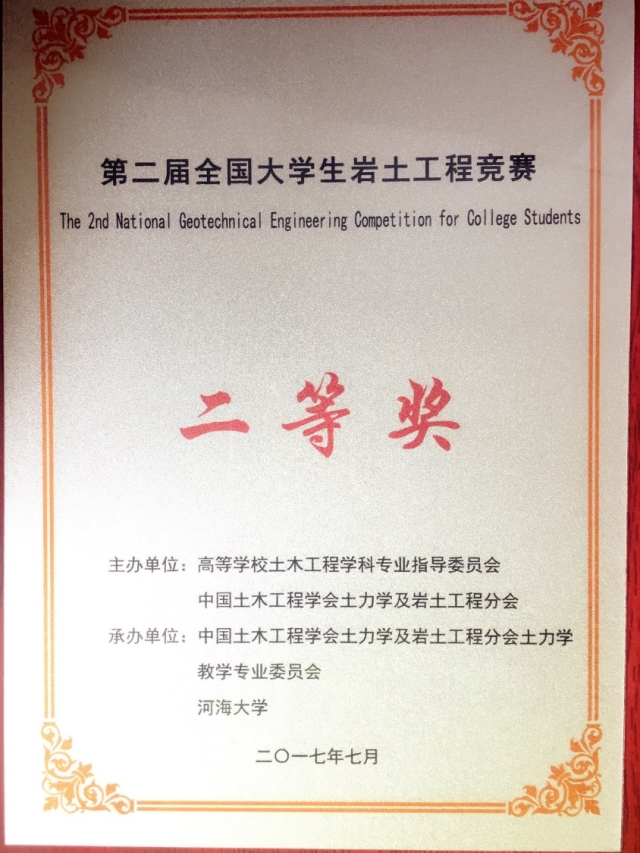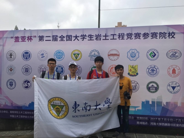 2017年7月9日-11日,第二届全国大学生岩土工程竞赛决赛在河海大学成功举办。此次竞赛共吸引了同济大学、哈尔滨工业大学、williamhill英国官网、清华大学、浙江大学、河海大学等国内66所高校参赛,经过初赛遴选出30所高校晋级决赛。我校参赛队(051141黎宝山、051141许胜寒、051141杨凯文)同各大高校选手经过激烈角逐,最终以模型总重304.52g、沉降最大值1.62mm的成绩斩获二等奖。竞赛由williamhill官网副院长童小东老师和陆金钰老师担任指导教师。这是我校自该项赛事举办以来首次参赛,东南学子在指导老师的带领下拼搏进取,为学校争得荣誉,展现了我校师生的风采。
