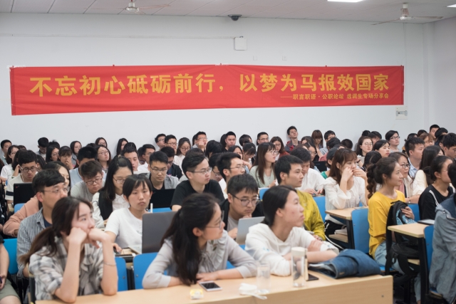 第一位分享嘉宾鲁梦学姐从选调政策、笔试和面试三个方面进行了介绍,包括报考方式、报考职位、录用分配、任职定级,以及笔试的行测、申论,面试的题型和注意事项,面面俱到,全面且细致的为同学解析了选调生从申请到成功的各个环节;第二位分享嘉宾廖家男学姐详细地回答了“什么是选调生”、“为什么加入选调生队伍”、“学生工作经历对自己选择的影响”以及“如何准备选调生考核的”四个问题,展示了用自身所学报效国家的情怀。第三位分享嘉宾刘智欣学长用幽默诙谐的语言娓娓道来,为大家分析了就业方向的选择、关于“定向选调”以及选调考试复习策略三大问题,强调了复习时要注意细节,更要注重总体原则,并告诫大家成为选调生不是为了享福而是为了全心全意为人民服务;最后一位分享嘉宾王孟伟学长的学生工作经历丰富,曾担任过班长、团总支书记、研究生综合党支部的书记,一直走在为身边同学服务的路上,他说选择选调生、成为选调生、服务人民群众是他服务同学工作的延续和升华。