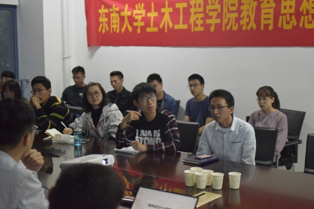 接下来,到场的学生骨干们纷纷发表了自己的观点。研会主席郑逸轩同学从自身实践经历,学生工作经历以及志愿服务经历出发,提出要保持青年人的责任感和使命感,在进行职业生涯规划和选择时要紧密联系生产生活进行价值创造,埋头苦读的时候也要抬头看路,做一个对社会有价值的人。研究生综合党支部书记成维佳同学谈及自己的经历及学生工作体会,认为青年学生应该有坚定的理想信念,不能做一个精致的利己主义者,身边确实存在少数同学用功利的态度去对待学业、社会工作、甚至入党这一问题,要强化青年学生的家国情怀和责任担当,做一个有理想有抱负的人。2015级本科生党支部书记陈昊辉同学表示自己的理想是成为一个又红又专的人,既要有坚定的理想信念,努力争当身边同学的道德楷模,又要加倍勤奋学习,成为学习上的尖子生,为将来更好的服务社会打下扎实的专业基础。2017级硕士年级长陈熹同学结合自己五年东大求学经历,引用习总书记的话表示希望自己成为一个通过不断奋斗换取更多幸福的人。研会副主席马溢轩同学从身边同学们开展学术科研的状态出发,希望能成为一个潜心科研学有所成的人。宣传中心学生主席王浩琛同学表示在校期间应该把未来的职业生涯和学业同步进行规划和准备,在完成学业的过程中适时调整自己的职业规划,做一个对未来社会有着充分准备的人。