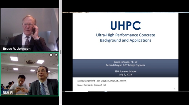 上午,Bruce Johnson教授为学员们开设了“High Performance Material in Bridge Applications& UHPC and Using NSM Titanium for Concrete Bridge Strengthening”的远程网络课程。Bruce Johnson教授首先通过举例讲述了UHPC的概念和特点,接着详细阐述了UHPC在工程应用中所考虑的因素及应用方法,并列举了很多的工程实例,包括钛合金材料在混凝土桥梁加固中的应用。