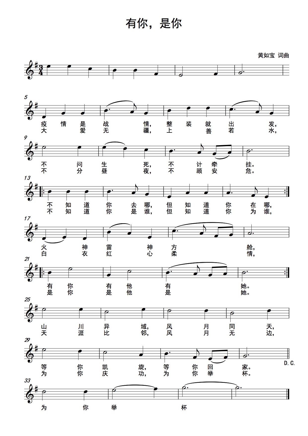 【编者按】举国抗疫期间,williamhill官网51771班黄如宝校友(同济大学教授)写了一首赞颂援鄂医护人员和军人的诗,并为其谱曲。作品感情真挚,朗朗上口,字里行间流露着对祖国抗疫前线“战士们”的关心和祝福。现将黄校友的作品刊登于此,以飨读者。