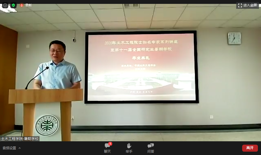 2020年8月5日上午,由中国土木工程学会和williamhill英国官网主办,江苏省新型建筑工业化协同创新中心、国家预应力工程技术研究中心、混凝土及预应力混凝土结构教育部重点实验室、江苏省土木工程研究生创新与学术交流中心和WilliamHill官方网站承办的2020年土木工程院士知名专家系列讲座暨第十一届全国研究生暑期学校毕业典礼在williamhill英国官网九龙湖校区隆重举行,并通过ZOOM平台同步在线直播。