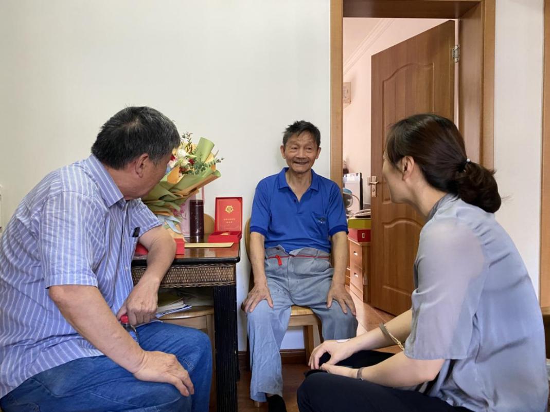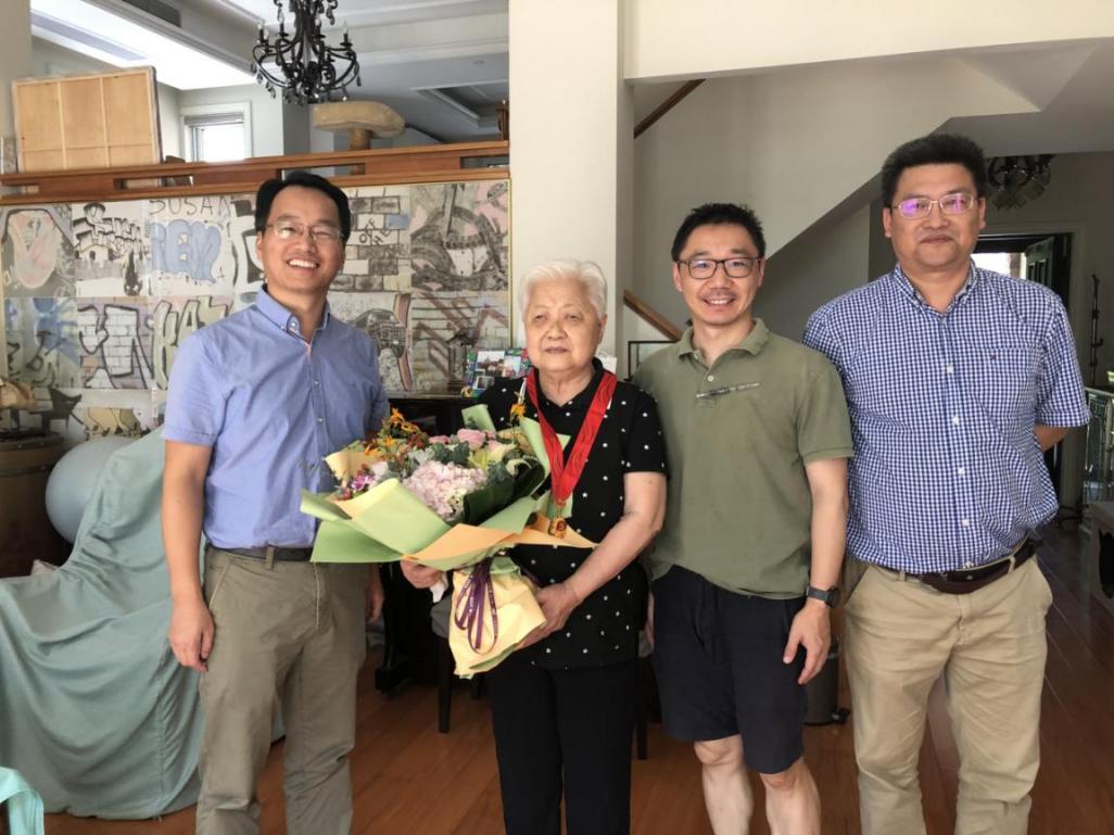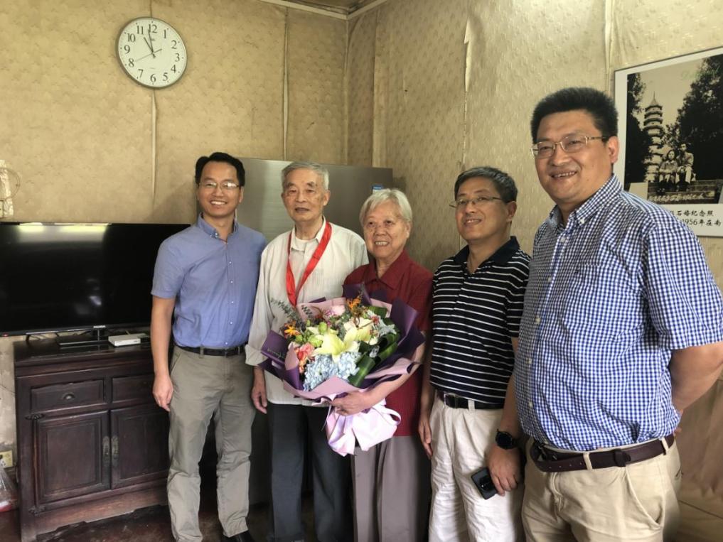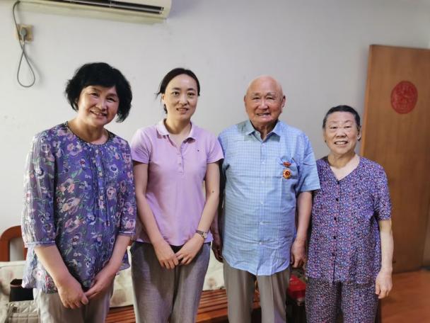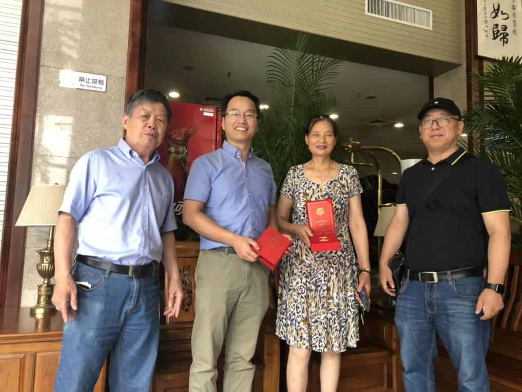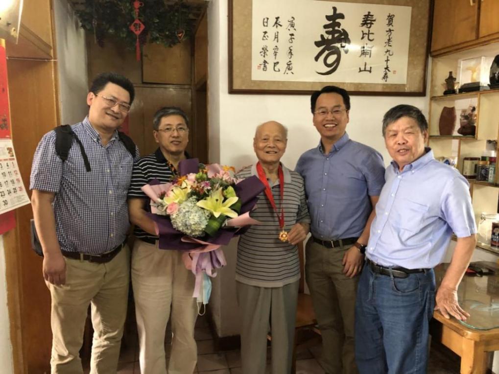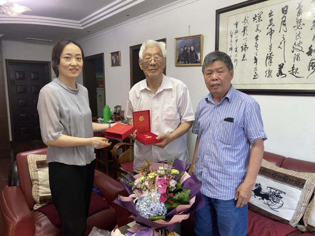 6月21日下午,学院党委刘静书记,退休教师党支部副书记、关工委委员龚建民老师,宣传秘书张洁琪老师一行分别来到王功勋老师、江亚英老师先生、陶光华老师、刘振田老师住处,为他们颁发纪念章、送上鲜花和慰问金。