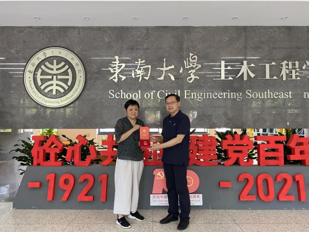 6月19日下午,学院党委刘静书记和院机关支部书记陈韵老师来到唐九如老师的家中,向唐老师颁发“光荣在党50年”纪念章、送上鲜花和慰问金。刘静书记一行亲切询问唐老师及其家属的生活和身体状况,认真倾听他们缅怀艰苦岁月,共话党史共忆初心。