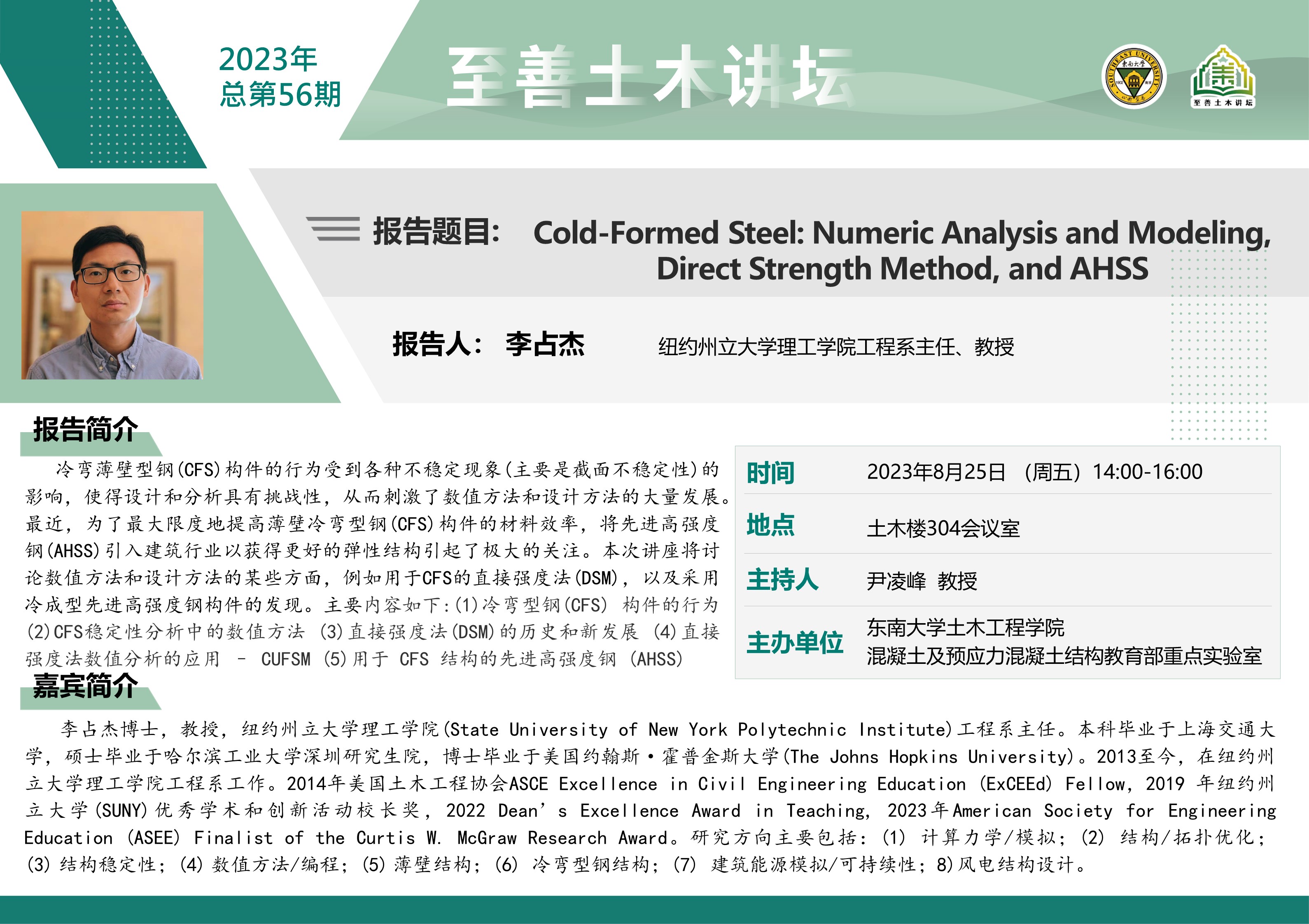 至善土木讲坛 2023年总第56期 | Cold-Formed Steel: Numeric Analysis and ModelingDirect Strength Method, and AHSS
