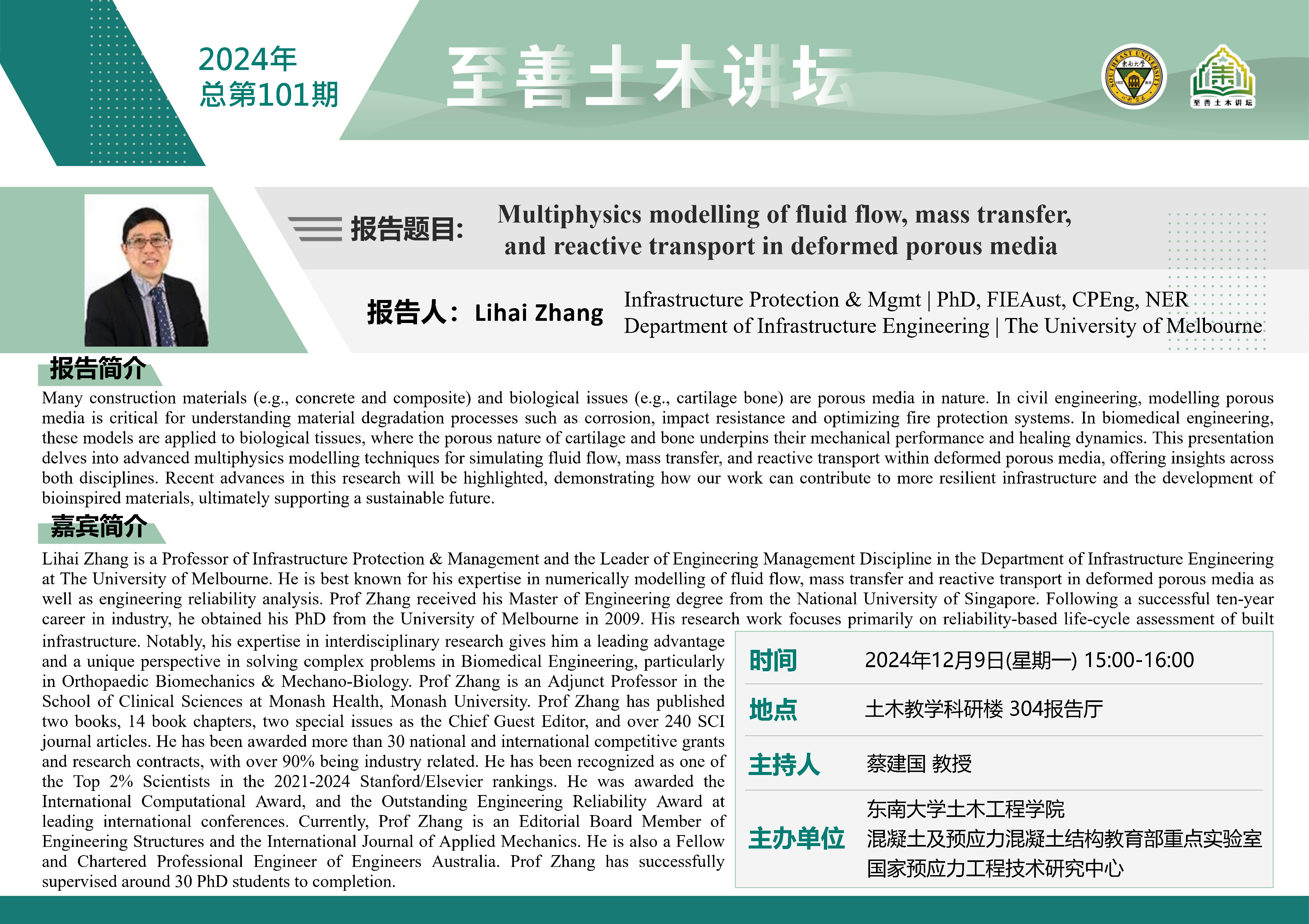 至善土木讲坛2024年总第101期 | Multiphysics modelling of fluid flow, mass transfer?and reactive transport in deformed porous media