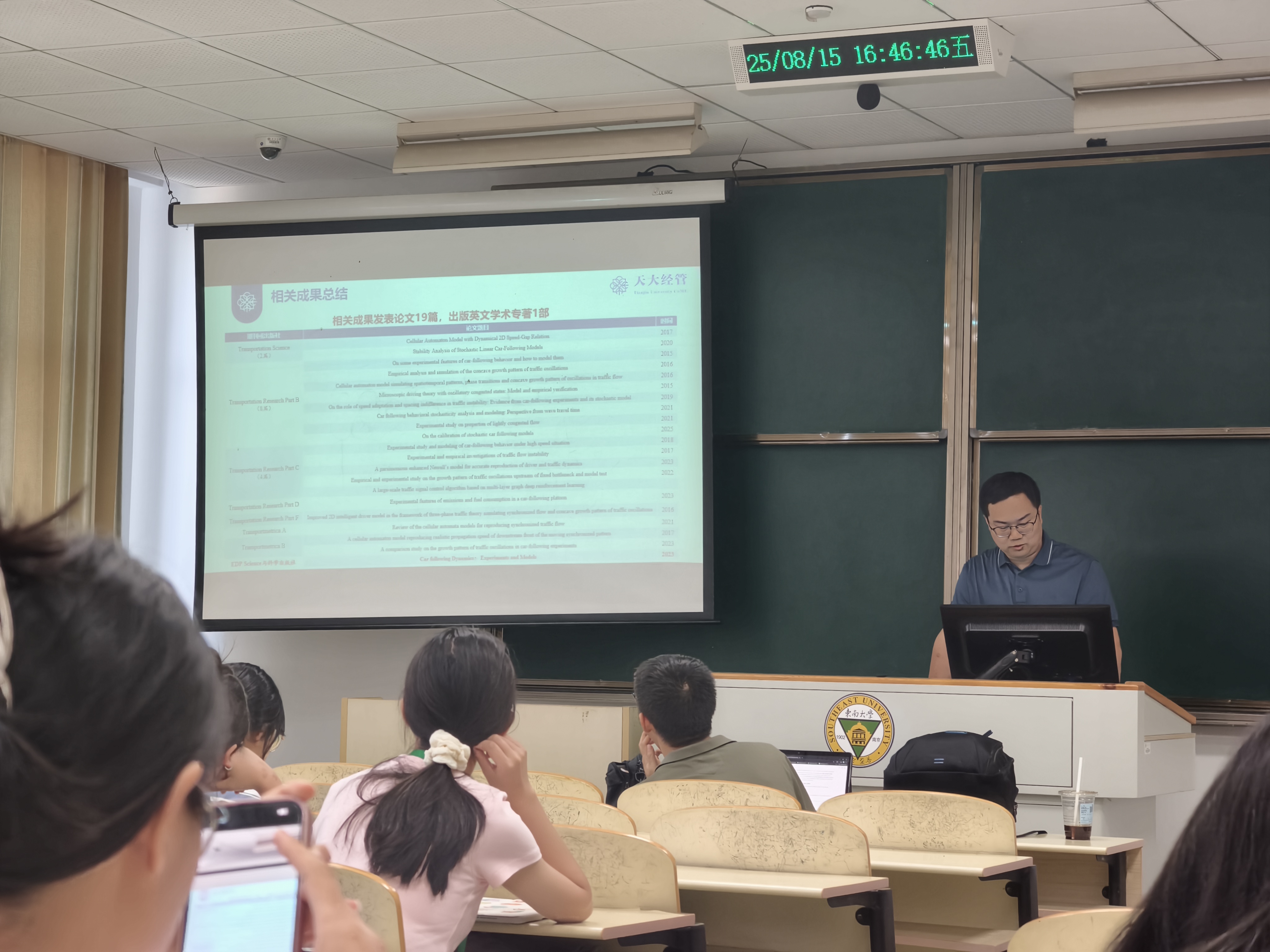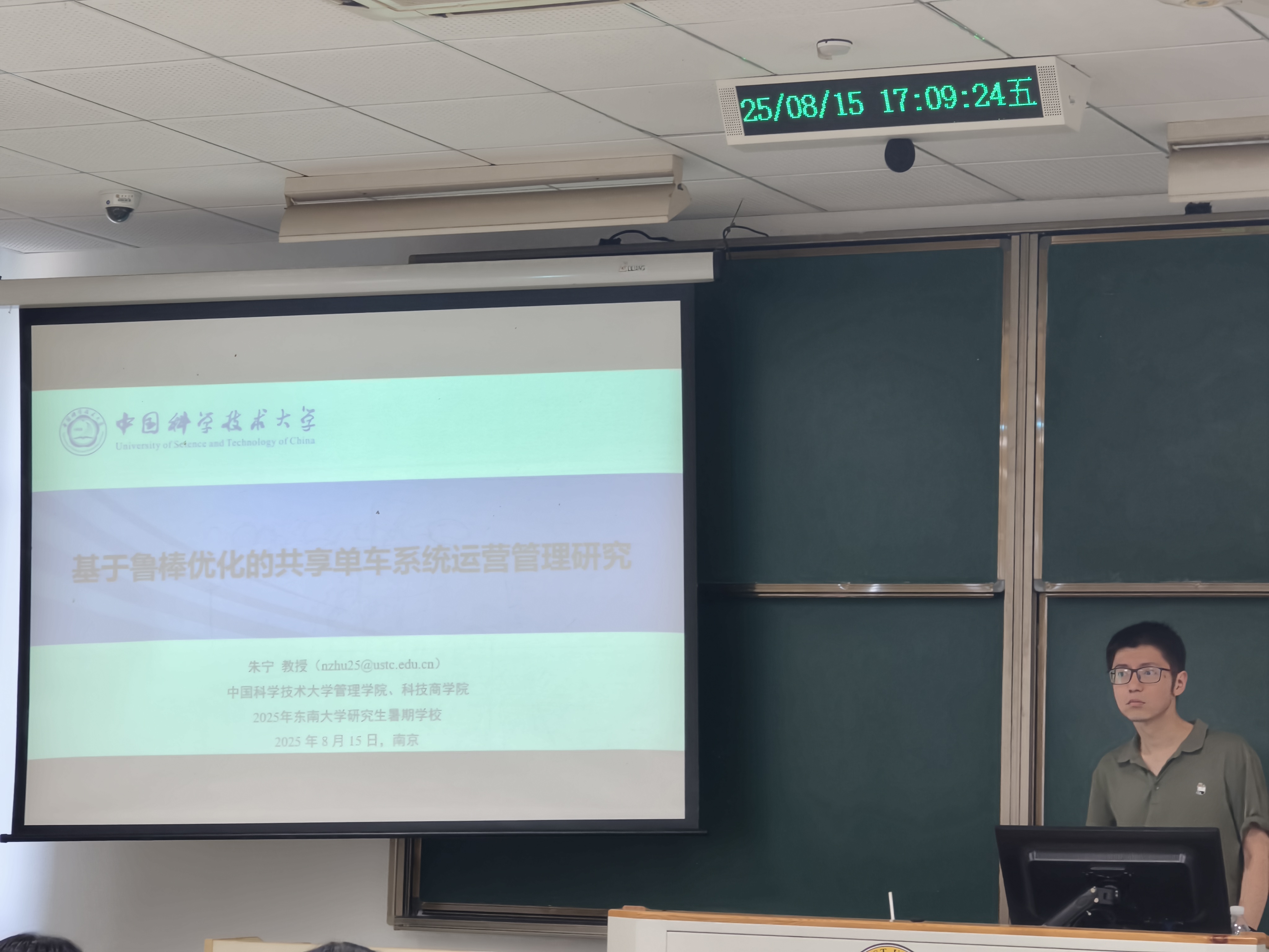 2025年8月15日下午,天津大学田钧方教授首先带来了题为“城市道路交通流建模与仿真”的报告。田教授结合团队最新研究成果,系统介绍了宏观、微观及中观交通流模型的构建原理,深入分析了大数据与人工智能技术在交通仿真中的应用,并结合典型城市路网案例,展示了仿真技术在交通管控策略评估与优化中的价值,为智慧交通发展提供了理论支撑与实践参考。随后,中国科学技术大学朱宁教授分享了题为“基于鲁棒优化的共享单车系统运营管理研究”的报告。朱教授团队创新性地将不确定性建模、强化学习与分布式算法相结合,构建了适应实时需求波动和突发干扰的共享单车调度模型。报告以上海、深圳等城市为案例,详细解析了如何利用鲁棒优化技术降低运营成本、优化车辆分布,并对共享经济模式下的可持续交通发展路径进行了前瞻性探讨。