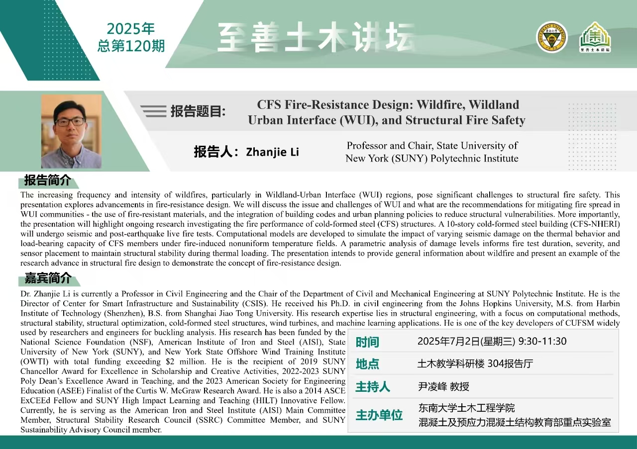 至善土木讲坛2025年总第120期 | “CFS Fire-Resistance Design: Wildfire, Wildland Urban Interface (WUI), and Structural Fire Safety