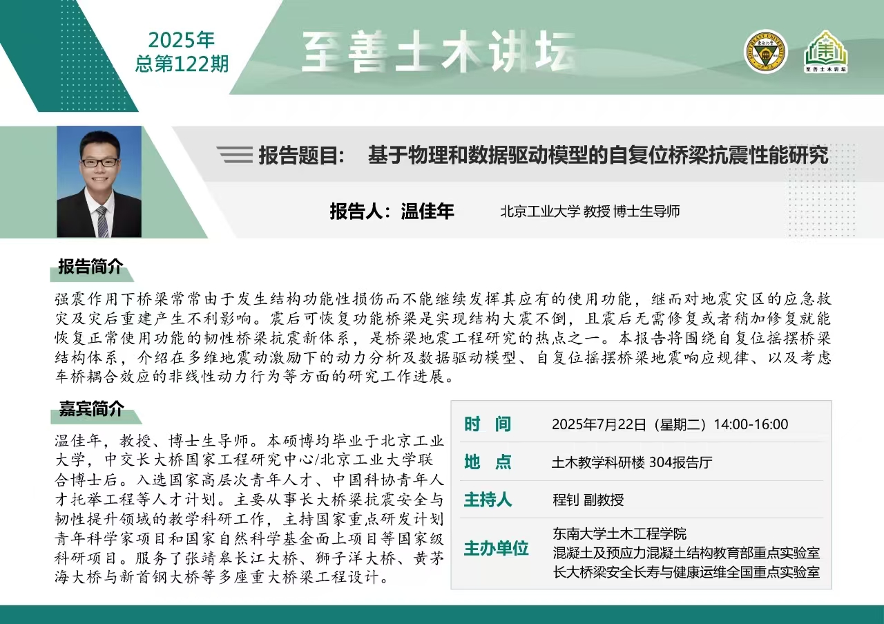 至善土木讲坛2025年总第122期|基于物理和数据驱动模型的自复位桥梁抗震性能研究